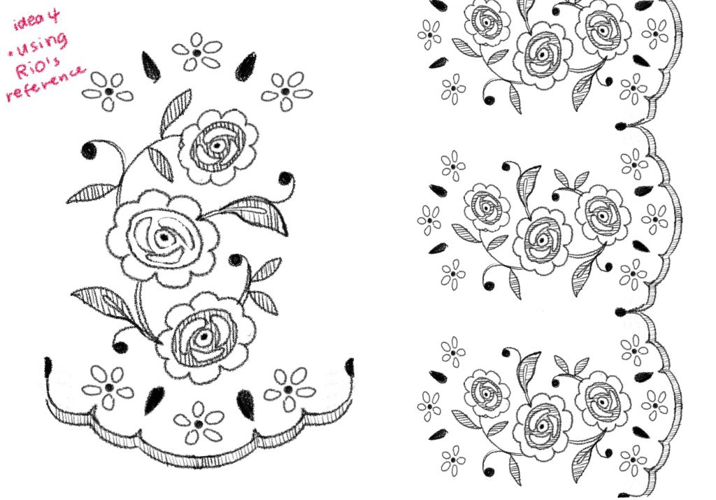 After discussing the ideas I had come up with, we deconstructed the pattern to pick out the details we liked and assembled them to achieve a new pattern. It looks like this!